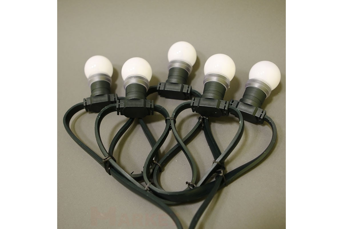 Данная гирлянда имеет лампочки в форме сферы. Корпус изготовлен из пластика. Это устройство обладает массой преимуществ. Способно осуществлять свою работу на протяжении 100 000 часов. Лампы очень надёжны. Могут создавать равномерное освещение или же мерцать с помощью контролера.