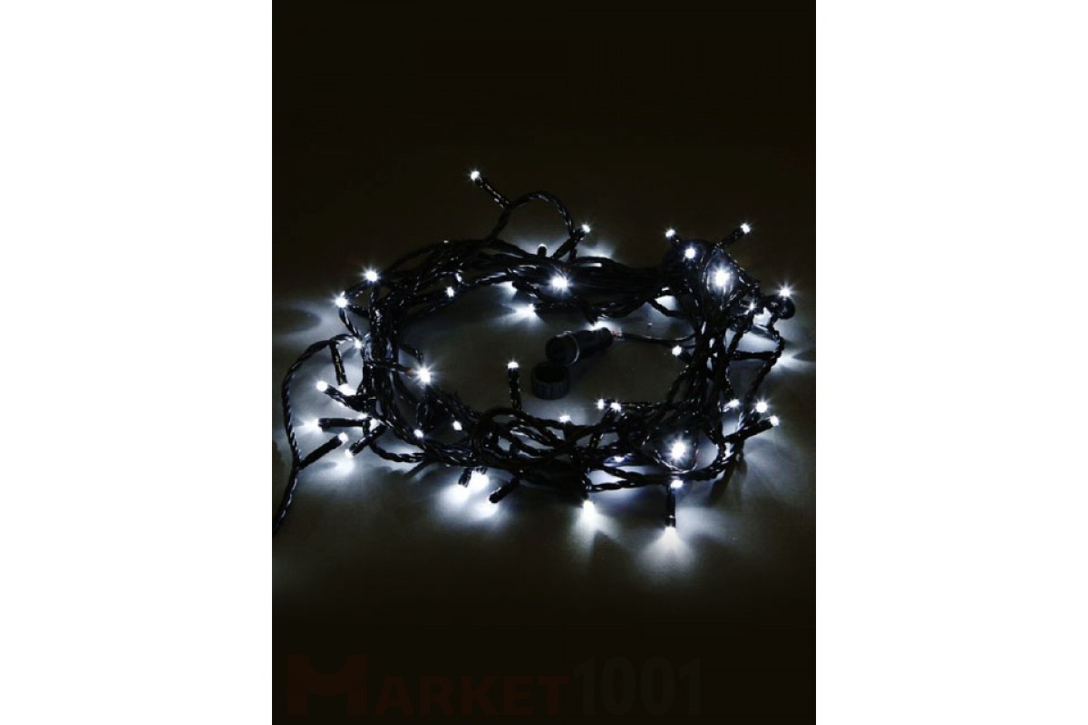 Светодиодная гирлянда, 10 метров, 100 светодиодов, цвет светодиодов белый, 220В, с возможностью стыковки нескольких гирлянд до 10 штук, с контроллером. Кабель ПВХ черного цвета. Мощность — 10W.