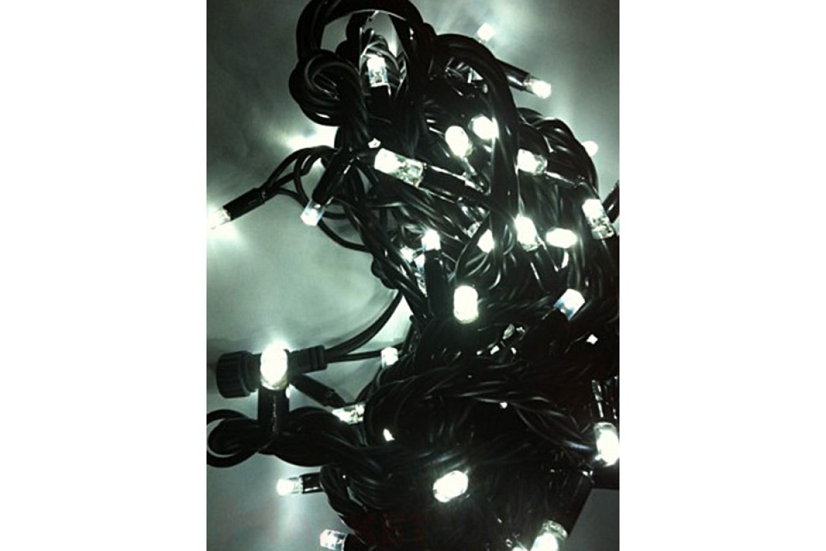 Светодиодная гирлянда, 10 метров, 100 светодиодов, цвет светодиодов белый , 220В, с возможностью стыковки нескольких гирлянд до 10 штук, с контроллером. Резиновый кабель черного цвета. Мощность — 10W.