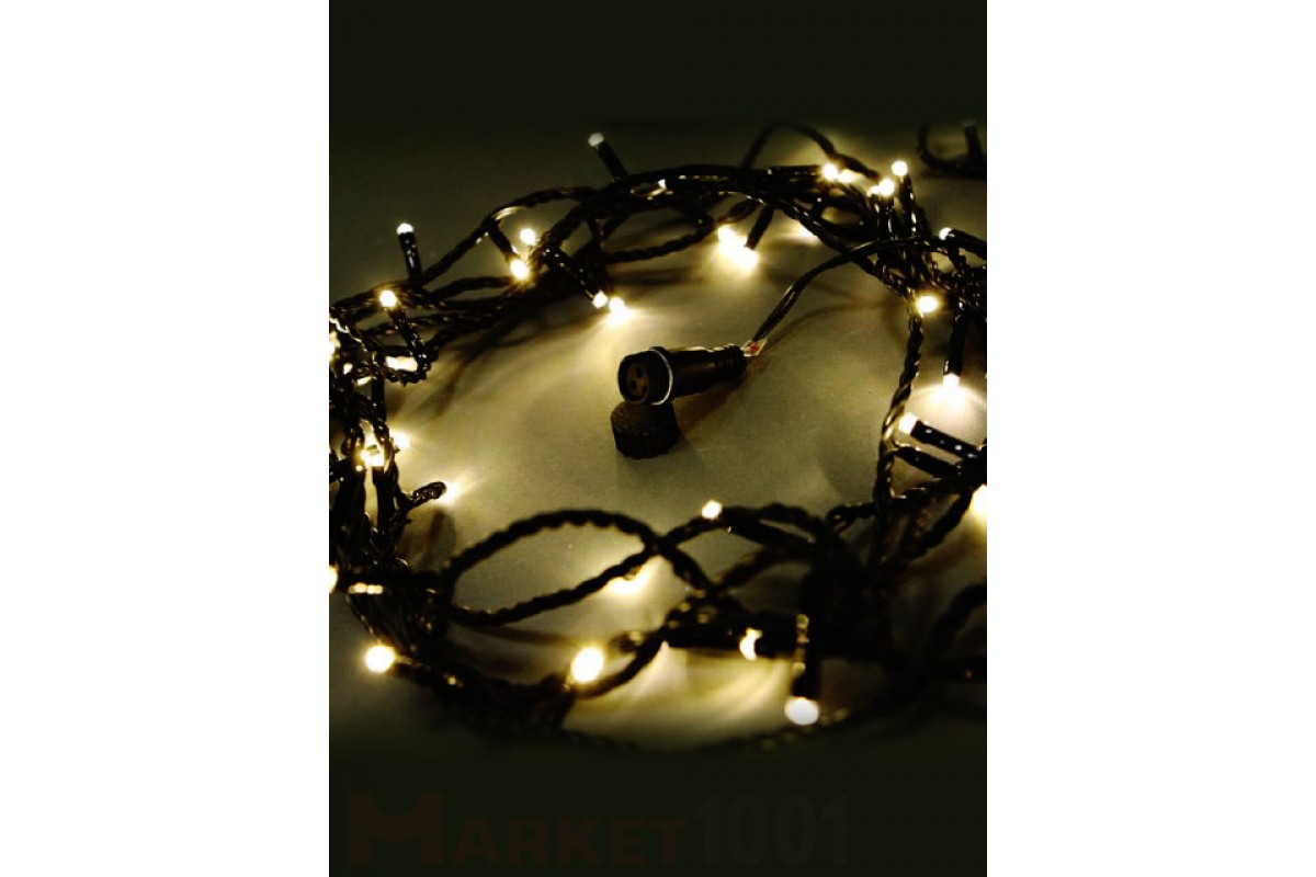 Светодиодная гирлянда, 10 метров, 100 светодиодов, цвет светодиодов теплый белый 220В, с возможностью стыковки нескольких гирлянд до 10 штук, с контроллером. Кабель ПВХ черного цвета. Мощность — 10W.