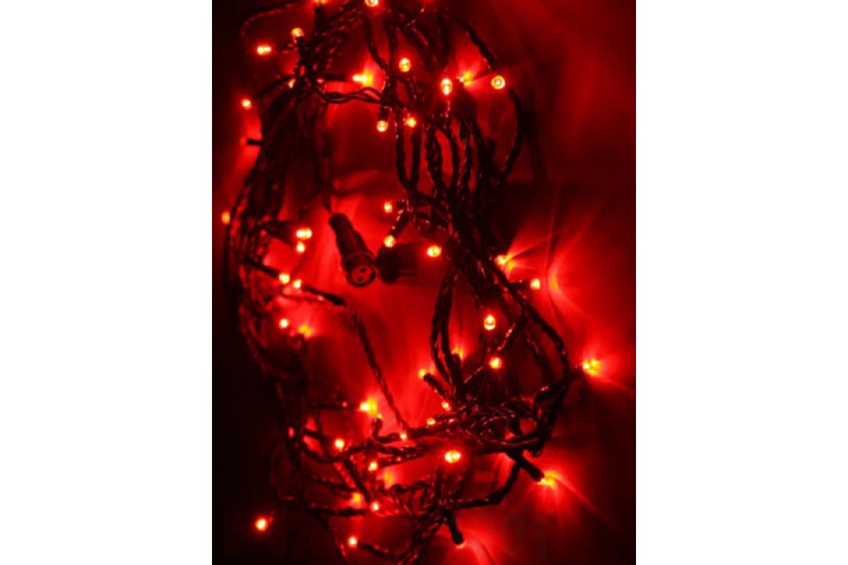 Светодиодная гирлянда, 10 метров, 100 светодиодов, цвет светодиодов красный, 220В, с возможностью стыковки нескольких гирлянд до 10 штук, с контроллером. Кабель ПВХ черного цвета. Мощность — 10W.