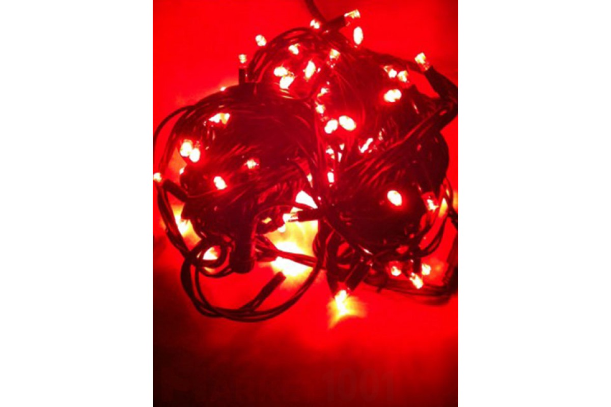 Светодиодная гирлянда, 10 метров, 100 светодиодов, цвет светодиодов красный , 220В, с возможностью стыковки нескольких гирлянд до 10 штук, с контроллером. Резиновый кабель черного цвета. Мощность — 10W.