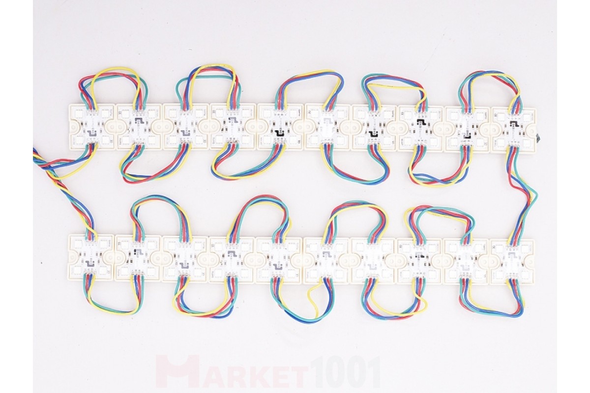 Светодиодные модули DKB 4SMD 5050 RGB 36x36x6 мм представляют собой шлейф или гирлянду из 20 модулей в пластиковом корпусе. Длина провода между модулями 20 мм. Светодиоды расположены в герметичном корпусе, обладают высокой степенью влагозащиты, вибро и удароустойчивостью.